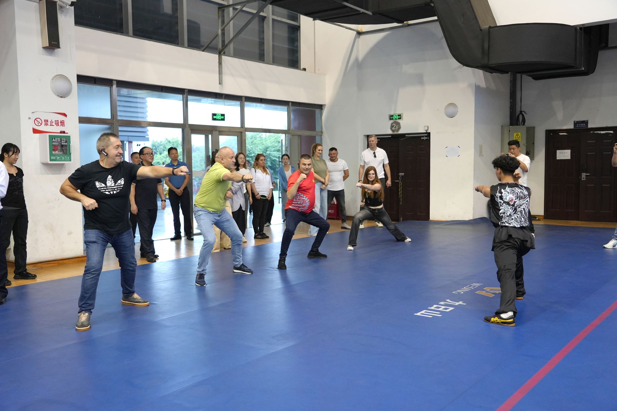代表团一行首先来到青江武术基地,观摩了武术套路、散打对抗及舞狮表演。外宾们对刚柔并济的中华传统武术和热闹喜庆的舞狮文化表现出浓厚兴趣,不时驻足欣赏、拍照记录,对师生们精湛的技艺表示赞叹。
