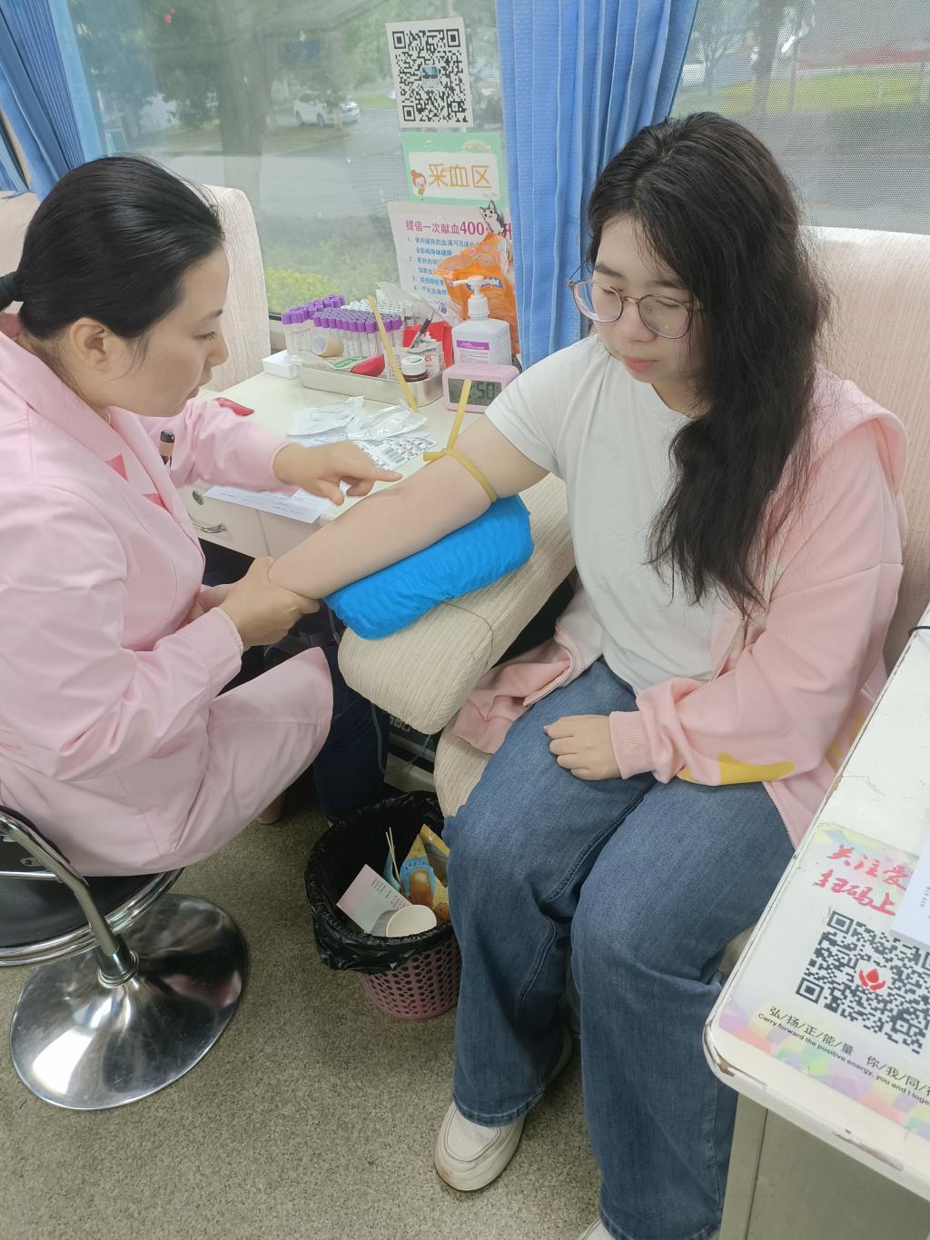 活动当天,虽艳阳高照,但前来献血的师生络绎不绝。在志愿者们的组织下,师生们按顺序进行了领表登记、血型测定、抽血和观察休息。在工作人员的讲解和鼓励下,不少同学们也克服恐惧,力所能及献出鲜血,处理创口之后,由志愿者带到休息区,每人赠送一份糖水和点心以及证书,同时询问并观察献血者身体恢复情况,整场活动有条不紊地进行着。遗憾的是,有不少同学因个人身体等原因这次不能献血,纷纷表示下次一定积极参加献血及其他志愿服务活动。