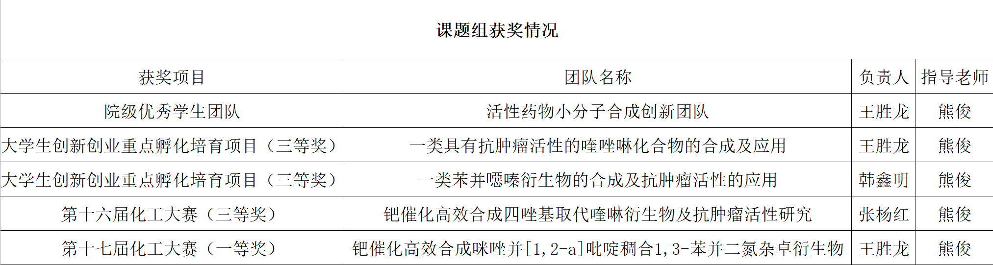 课题组“活性小分子杂环合成创新团队”是以熊俊副教授为带头人的科研创新团队。团队成员包括博士研究生1人,硕士研究生2人,本科生6人。其中,团队成员多次获得校级奖学金和各类荣誉称号,积极参与省校级比赛并 取得颇多成果。近年来,团队发表相关高水平学术论文7篇,其中J. Org. Chem.,Chin. J. Chem.,J Cell Mol Med.,Adv. Synth. Catal中科院二区,三篇SCI三区,一篇JOC影响因子4.198,申请国家发明专利5项,授权1项。