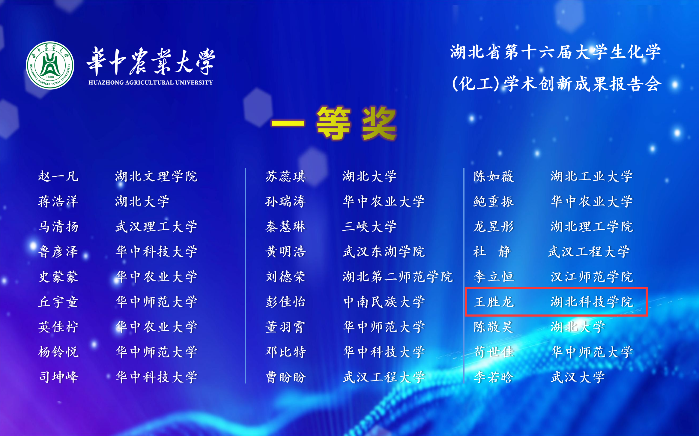 (通讯员:熊俊方儒由湖北省化学化工学会主办、华中农业大学(本科生院、理学院)承办的湖北省第十六届大学生化学(化工)学术创新成果报告会于2023年5月13日至5月14日在华中农业大学举行,我校学子在湖北省第十六届化学(化工)学术创新成果报告会上取得优异成绩