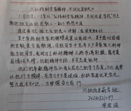 参加“弘扬科学家精神,共促优良学风”主题班会后,我深感科学家精神对药学专业意义非凡。科学家们爱国奉献、勇攀高峰,为真理执着探索,不怕失败,如同药学前辈研发药物时精益求精。我们作为药学专业学生,应学习这种精神,在日常学习中严谨求进,不弄虚作假,培养自己的创新思维,为建设祖国储备知识,以优良学风为帆,向着梦想起航。