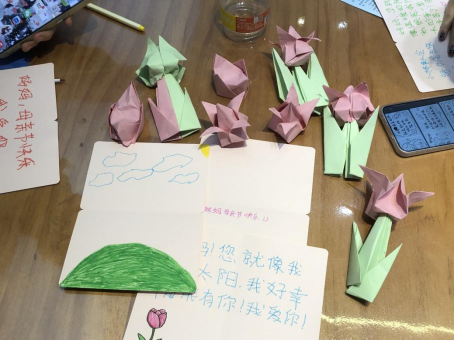 活动伊始,志愿者带领孩子们制作感恩贺卡。通过展示不同风格的贺卡范例,从色彩搭配到祝福语撰写技巧,细致讲解制作要点,鼓励孩子们用文字传递真情。孩子们认真挑选样式,在志愿者指导下写下“妈妈,您辛苦了”“愿您永远健康快乐”等真挚话语,将贺卡作为节日礼物送给母亲。