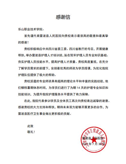 12月12日,BV伟德官方网站圆满完成了对雷波县护理人才三期班的帮扶培训工作,三期帮扶培训班分别于2023年7月、11月、12月开班,来自雷波县人民医院、雷波县中彝医院、妇幼保健院及部分乡镇卫生院共计149名学员先后参加了培训。派出单位特意给学校发来感谢信,感谢学校的支持与帮扶。