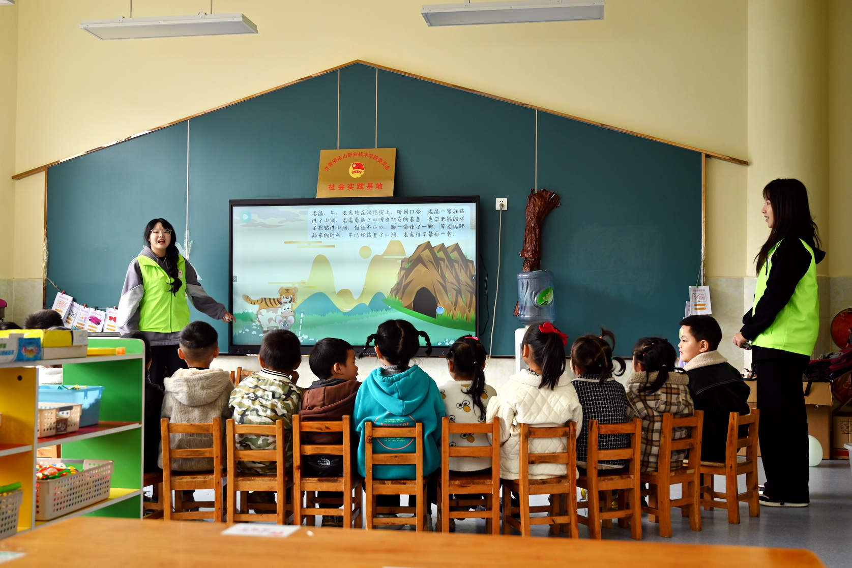 活动伊始,“我是家乡小导游”环节让小朋友们兴奋不已。团队成员通过精心准备,介绍了金口河区的历史、文化和旅游景点,引导孩子们用普通话讲述家乡的风土人情,鼓励他们用稚嫩的语言表达自己的想法和感受。随后,团队成员为孩子们带来了十二生肖的故事,详细解释了每个生肖的由来、特点和民间传说,让孩子们了解到中国传统文化中这一独特而又富有象征意义的部分。活动还特别安排了“健康操”环节,在团队成员的带领下,孩子们一边念着健身口诀,一边随着节奏进行锻炼。