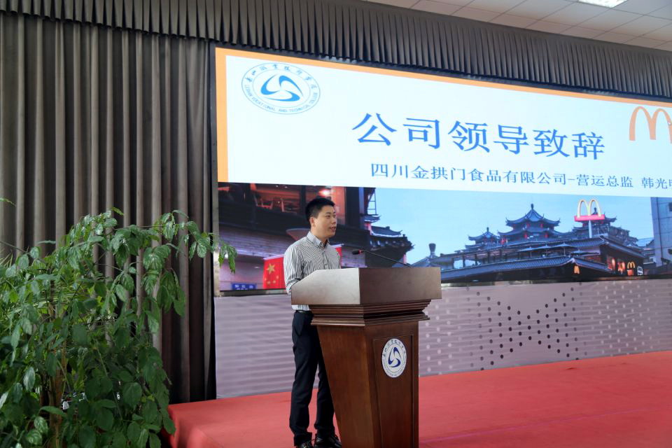 邵其会受学院领导委托授予四川金拱门食品公司为工商管理类专业“双师型”教师培养培训基地,表示希望进一步加强产教融合、加强“双师型”教师培养,提升教师业务技能,更好地为企业、社会培养高素质技术技能型人才。