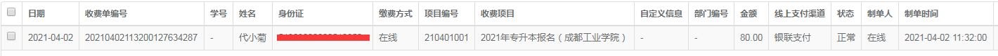 由于缴费系统原因,报考学生代小菊缴费信息未被统计(缴费信息见图1),导致其被误认为放弃报考成都工业学院。现将代小菊同学报名信息进行补报,并进行公示。