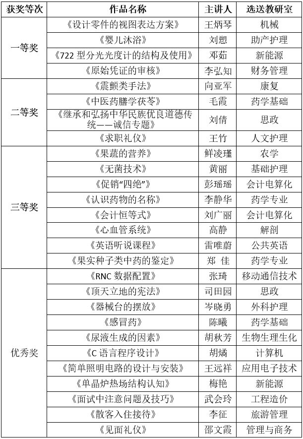 经大赛组委会研究,根据成绩排名,拟评定《设计零件的视图表达方案》等4件作品为一等奖,《震颤类手法》等4件作品为二等奖,《果蔬的营养》等8件作品为三等奖,《RNC数据配置》等11件作品为优秀奖。具体名单如下: