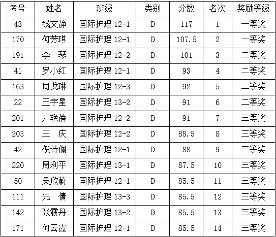 按照四川省高校外语教育研讨会文件规定,产生一等奖2名、二等奖4名、三等奖8名。获得一等奖的两名同学国际护理12-1班钱文静、国际护理12-1班何芳琪代表学校参加复赛。