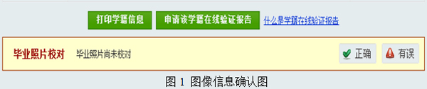 (五)图像校对确认路径:经身份合法验证后,点击网页顶部导航栏“学信档案”→点击网页左边导航栏“(图像校对)” →网页中部将出现个人图像信息,校对无误后点击图1中“正确”按钮进行确认。