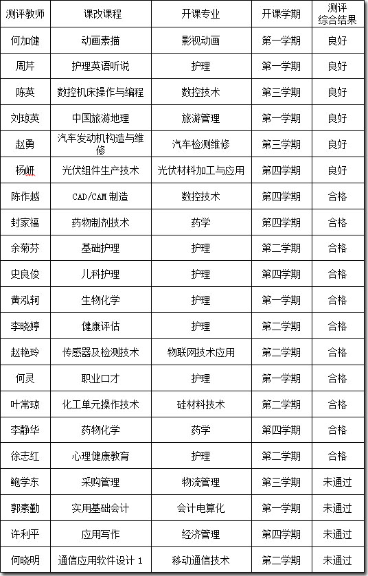 根据《BV伟德官方网站以能力为本位的项目化课程改革实施方案》(乐职院【2012】65号)文件精神,学院于2013年1月28-29日由常州工程职业技术学院专家对第一批21位进行项目化课程改革的教师进行了职业教育教学能力现场测评、2013年2月学院三大专业评委组对测评教师提交的材料进行了评审。经2月28日学院项目办领导小组会审核,现将综合测评结果公示如下: