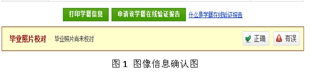 (五)图像校对确认路径:经身份合法验证后,点击网页顶部导航栏“学信档案”→点击网页左边导航栏“(图像校对)” →网页中部将出现个人图像信息,校对无误后点击图1中“正确”按钮进行确认。