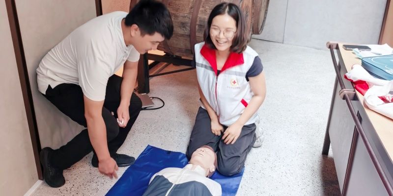 实操演练现场氛围热烈,酒厂员工分组围站在仿真模型旁,在三位教师的指导下逐一上手练习。教师们穿梭于各小组之间,紧盯每一个动作细节,针对按压位置偏移、力度不足、通气方式不当等问题及时纠正,耐心示范调整,确保每位学员都能掌握标准操作流程。最后的技能考核环节,学员们依次完成实操展示,全部顺利通过考核,真正做到“学懂、会用、能用好”。