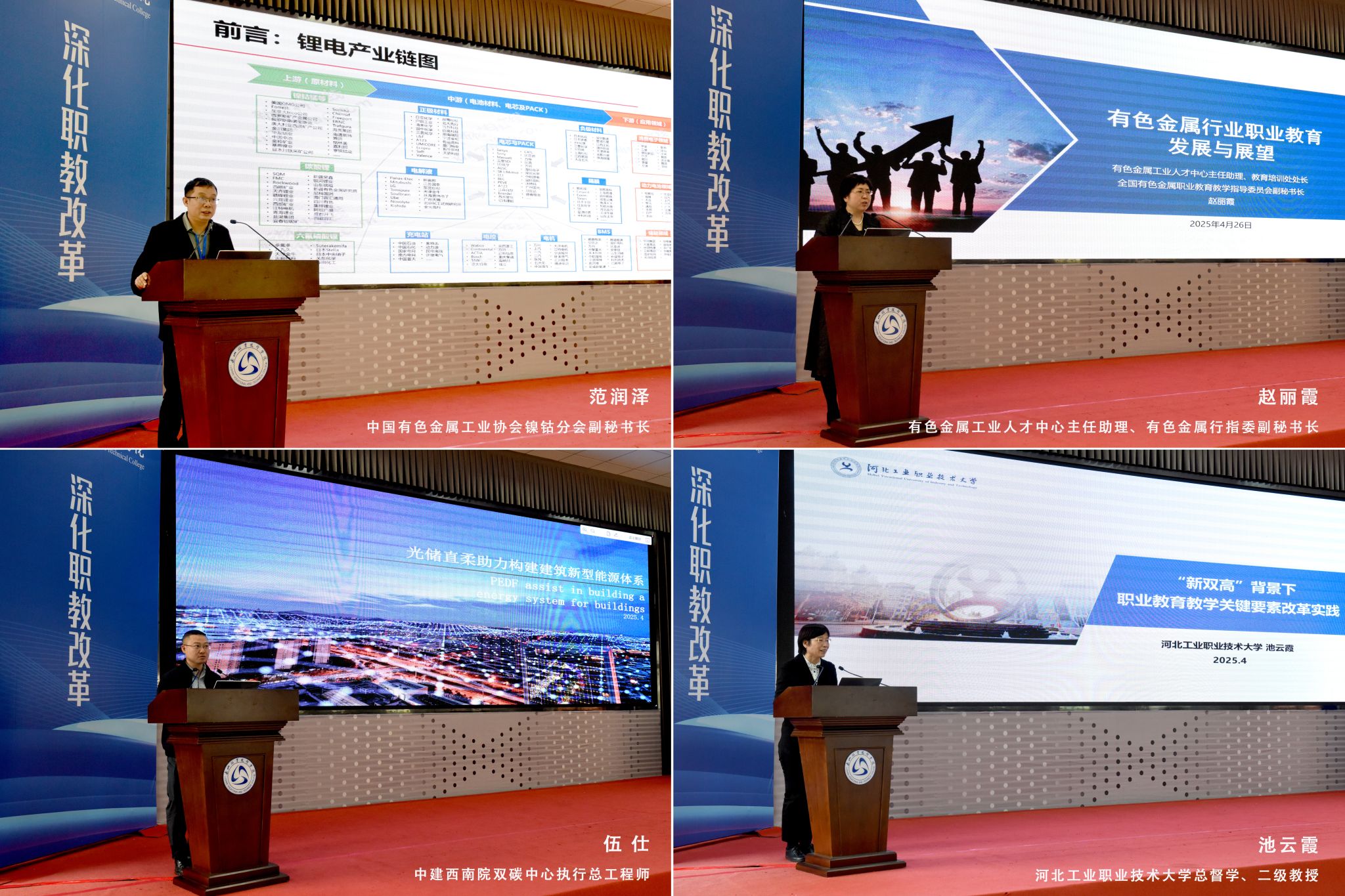 在专家讲座环节,有色金属行业大咖带来了前沿观点与实践经验。中国有色金属工业协会镍钴分会副秘书长范润泽剖析中国锂电产业挑战与机遇,指出职业教育应聚焦产业链关键环节培育人才。有色金属工业人才中心赵丽霞提出对接“双碳”目标、深化师资建设、推进综合育人三大策略,强调以产教融合共同体实现教育链、产业链、人才链深度衔接。中建西南院伍仕结合光储直柔技术案例,为专业课程融入“建筑能源管理”“智能微电网”等模块提供实践路径。河北工业职业技术大学池云霞分享 “对接产业集群打造专业群、校企共建‘双元’课程、建设产教融合实训基地”的经验,提出通过“动态调整专业方向、强化国际标准对接”提升专业群服务产业的适应性。