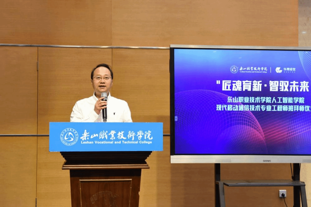 张佳致欢迎辞。他表示,拜师仪式是学校落实国家职业教育改革战略,推动“教育链、人才链与产业链、创新链”四链融合的重要实践,校企携手共育高技能人才。张佳希望现代工程师班学子争做新质生产力的弄潮儿、四型人才的践行者和川渝产业升级的先锋队,勉励他们在5G-A、6G预研等项目中锤炼本领,服务成渝电子信息万亿级产业集群建设。