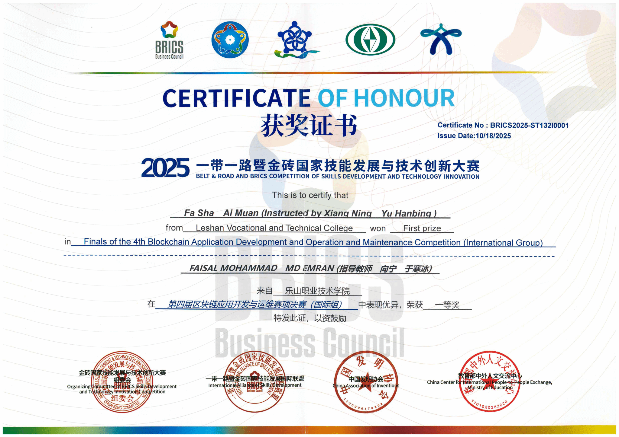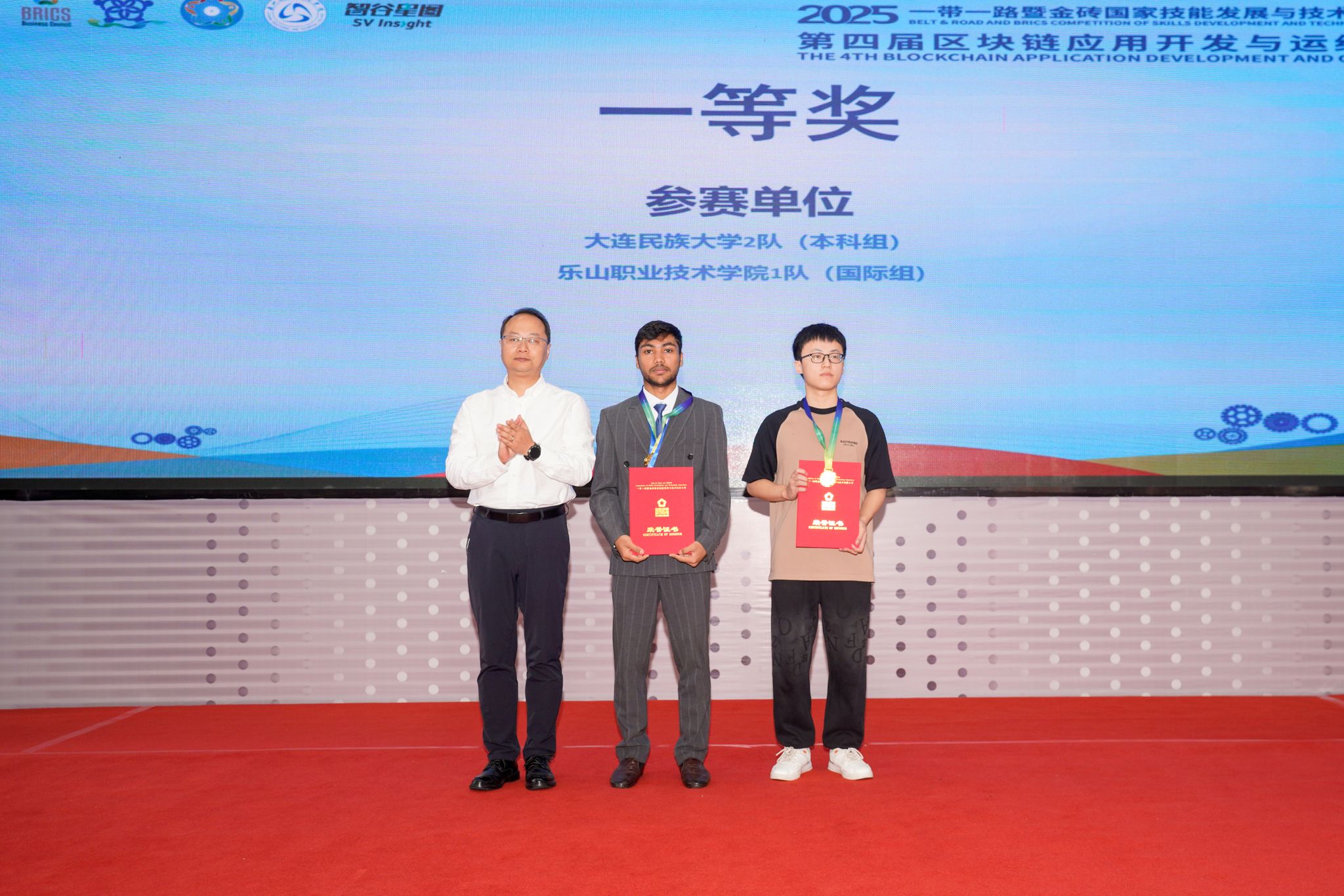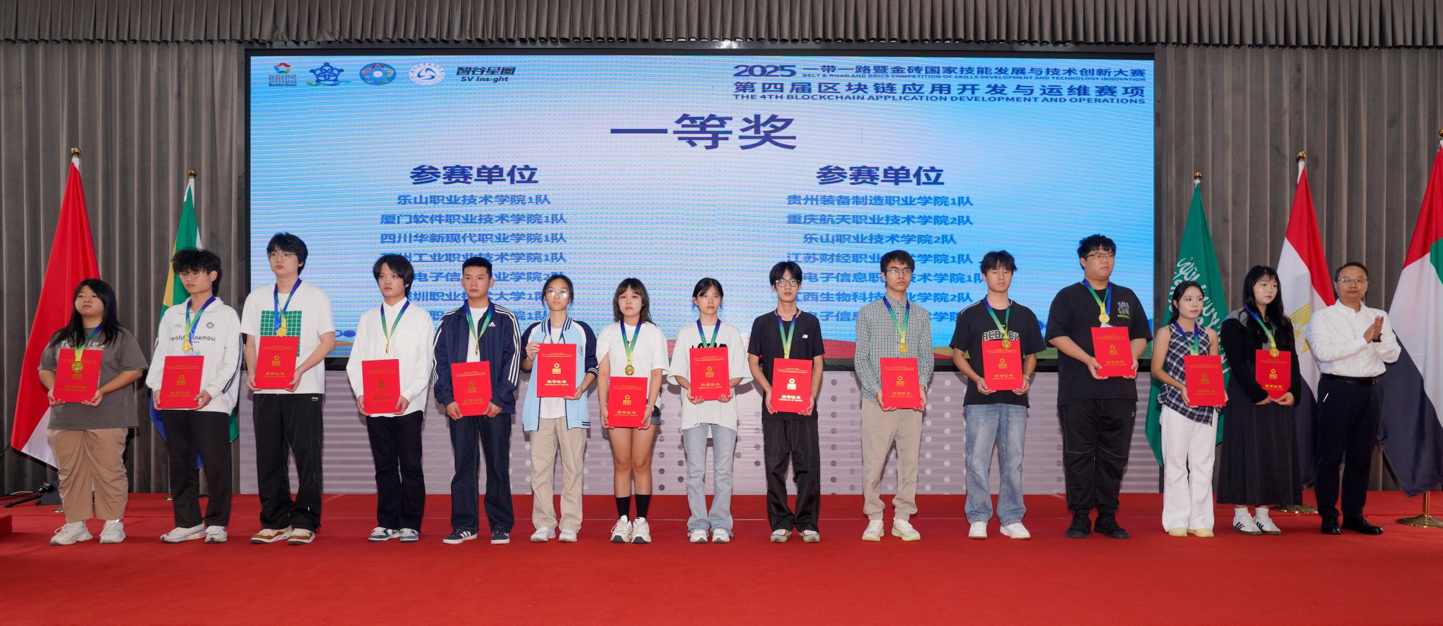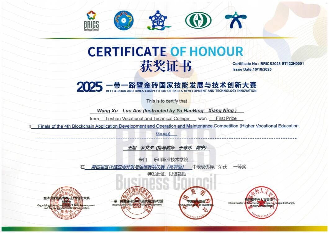 10月17日,2025“一带一路”暨金砖国家技能发展与技术创新大赛之第四届区块链应用开发与运维赛项在伟德官网举行,人工智能学院组织四支队伍参赛。经过紧张激烈的比赛,伟德官网学生共获得高职组、国际组三个一等奖,同时获得国际组二等奖。本届大赛由金砖国家工商理事会中方理事会、“一带一路”暨金砖国家技能发展国际联盟、“一带一路”暨金砖国家技能发展与技术创新培训中心、中国发明协会、教育部中外人文交流中心主办。伟德官网作为联合承办单位之一承办了本次比赛。
