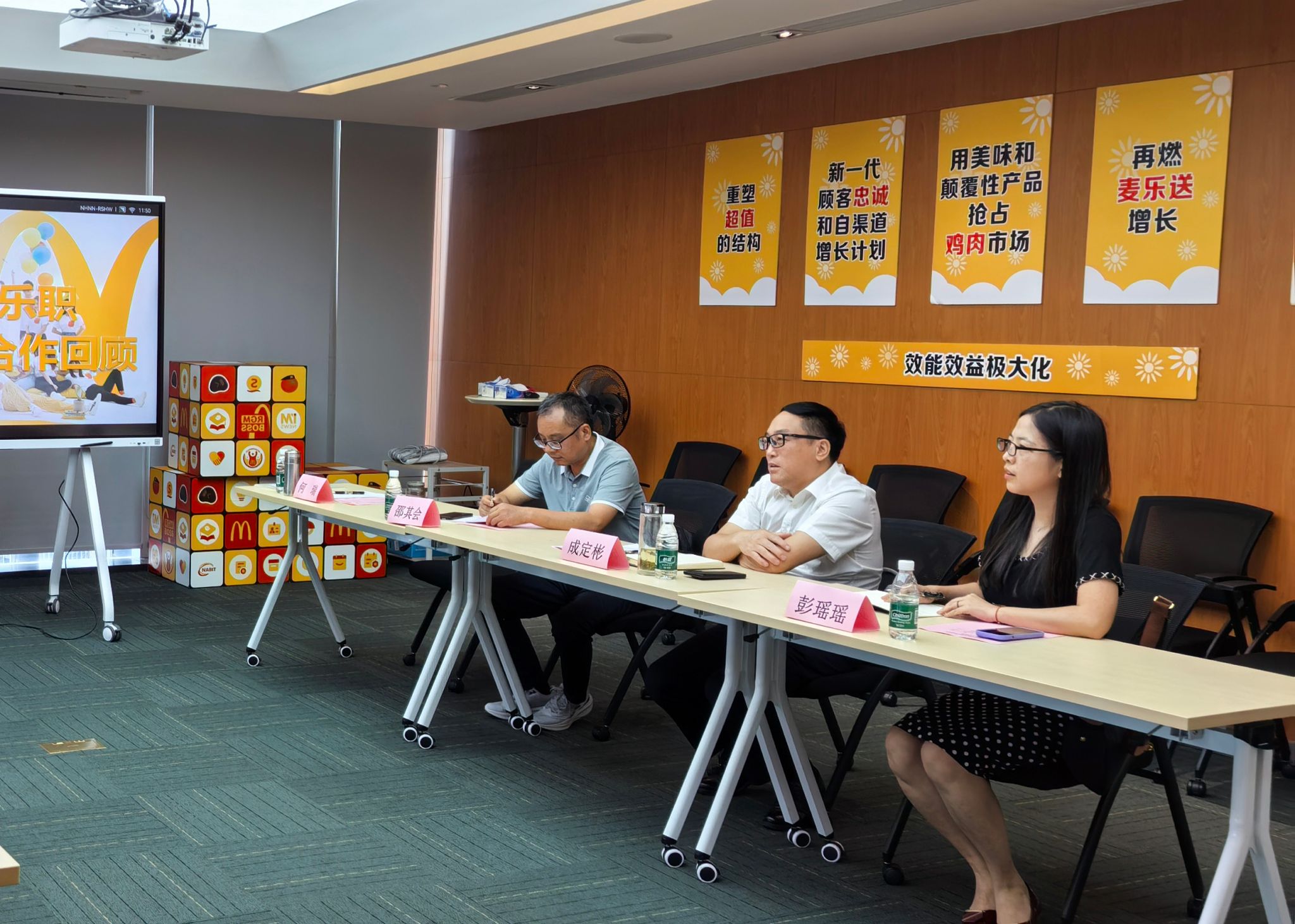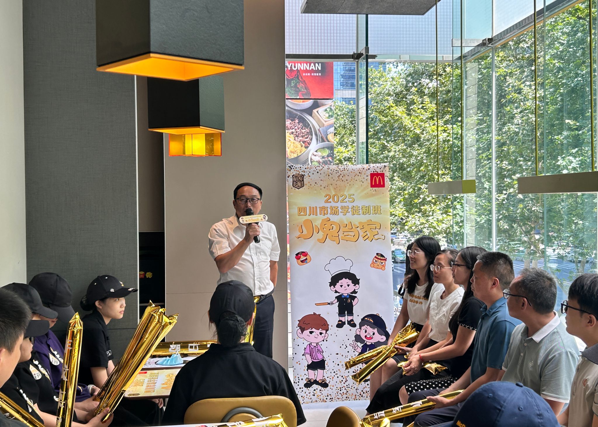 上午11时,校企双方在成都百扬大厦举行现代学徒制班交流座谈会。金拱门营运总监韩光明、人力资源部经理陈祥等企业代表出席。会上,成定彬肯定双方八年合作成果,校企双方围绕“麦苗班”人才培养、学生实习进展、未来合作方向展开深入交流,并就课程体系升级、数字化创新合作等方向达成共识。会后,成定彬一行参与“小鬼当家”实践活动总结会,肯定学生在门店运营中的表现。他对学生提出期许,希望他们珍惜实践机会,锤炼本领、提升素养,未来成为行业骨干,并向全程指导的企业导师表达诚挚感谢。