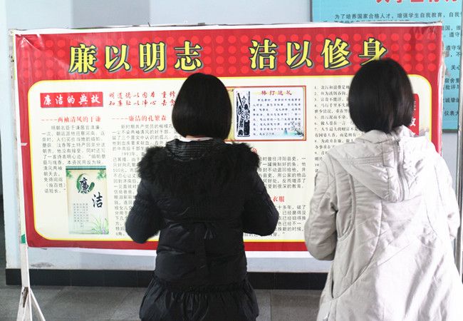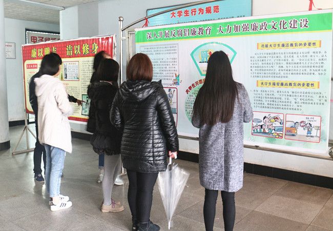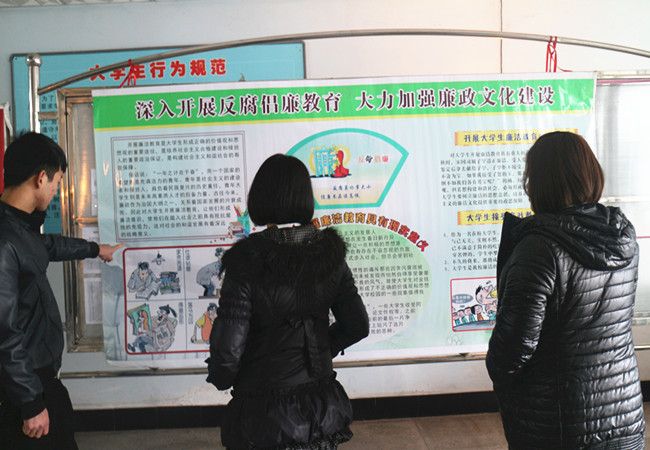廉以明志,洁以修身。前有两袖清风的于谦,后有反腐倡廉的习大大。展板上不仅展示了廉洁的典故及警示格言,还告诉了同学们接受廉政教育的重要性。说明了作为祖国未来的接班人的大学生,不仅要培养正确的价值观和思想观,还应树立廉洁的思想意识,为社会主义的廉洁文化提供重要的政思保障。同学们认真观看展板,不时相互讨论交流,面对“大学生廉政教育”宣传展板各抒己见。
