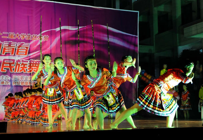 为丰富大学生的课余生活,弘扬中华文化 。由财经系承办的学院于2015年11月25日晚七点在新村校区举办了第十二届大学生艺术节---“舞动青春”民族舞大赛。这次活动很荣幸的邀请到以下重量级评委。他们是国家级一级舞蹈编导、乐山市舞蹈家协会主席熊永辉,舞蹈家协会会员、乐山市舞协副秘书长王妮女士,四川省舞蹈家协会会员、乐山市舞协理事刘华岭女士。到场的还有学院学工部部长、团委书记叶宏光,学院学工部副部长,团委副书记魏凡、罗建玮,旅游系党总支书记:李忠东,旅游系副主任黄剑波,以及各系部领导、老师和学生前来观看比赛。