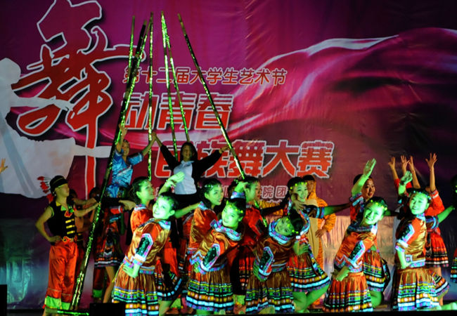 舞台上灯光璀璨,比赛现场充满了民族风情的味道,各式各样的民族服装为现场营造了民族气氛。十个参赛团队依次登场,伴随着音乐的旋律他们在舞台上翩翩起舞,宛若一个个活泼的精灵,他们的舞姿或曼妙飘逸或轻巧灵动,从不同的角度与层面演绎了舞蹈的美妙意蕴。有彝族舞、蒙古舞、朝鲜舞等不同类型的舞蹈,旅游系各位同学用肢体的律动向我们展示着苗族的美妙风情,一支“幸福苗寨”点燃了全场的热情,旅游系同学们用竹竿等道具搭配民族服装将大家带到了苗族晚会现场,构建了一幅人与自然和谐相处的画面,现场观众打开了手机手电筒进行摇摆与台上幸福苗寨形成完美的一幅动态画面,传达了给大家带来了视觉上的盛宴,感受到了苗族的异域风情。荣获了学院三等奖,这是他们付出汗水与精力收获的成果。