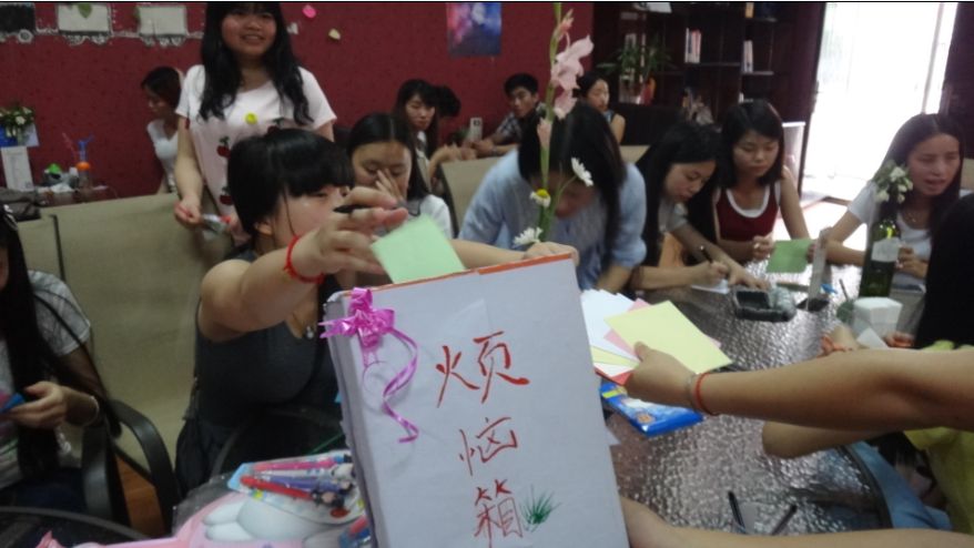 活动主要分为两个部分:一、用匿名的方式在纸上写下自己的烦恼放入烦恼箱中;二、每个人在烦恼箱中随机抽取一张并提出解决方案。