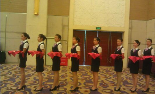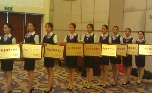 424下午3点,旅游系旅游12-1班、餐饮12-1班和旅游13-1班部分学生在金海棠大酒店二楼会议厅,担任了乐山市第六届劳动模范表扬大会的礼仪志愿者。本次会议有乐山市市长等重要领导出席,在旅游系潘老师的带领下,旅游系学生结合平时所学礼仪知识和训练,用规范的礼仪成功完成了此次颁奖大会的礼仪任务,展现了较高的礼仪服务水平。