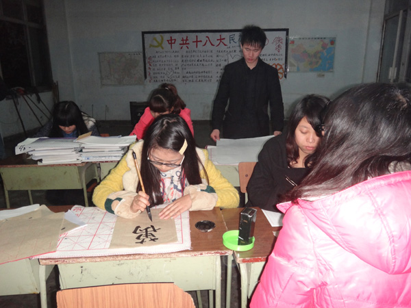 2012年12月16日晚六点,勤澜阁书法社成员在社长的带领下在普专餐饮12-1班教室举办了题为“传承书法文化 彰显书法魅力”的书法比赛。