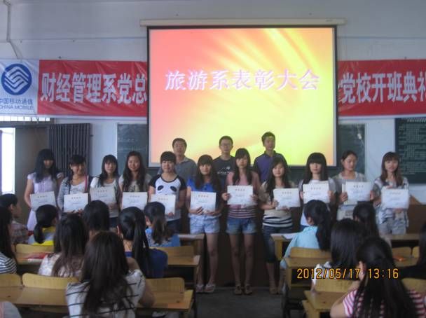 2012年5月17日13:00,旅游系召开了学生表彰大会。系党总支书记李忠东、学管办黄剑波副主任、教务办何加健副主任、各班级辅导员以及全系学生参加了此次会议。