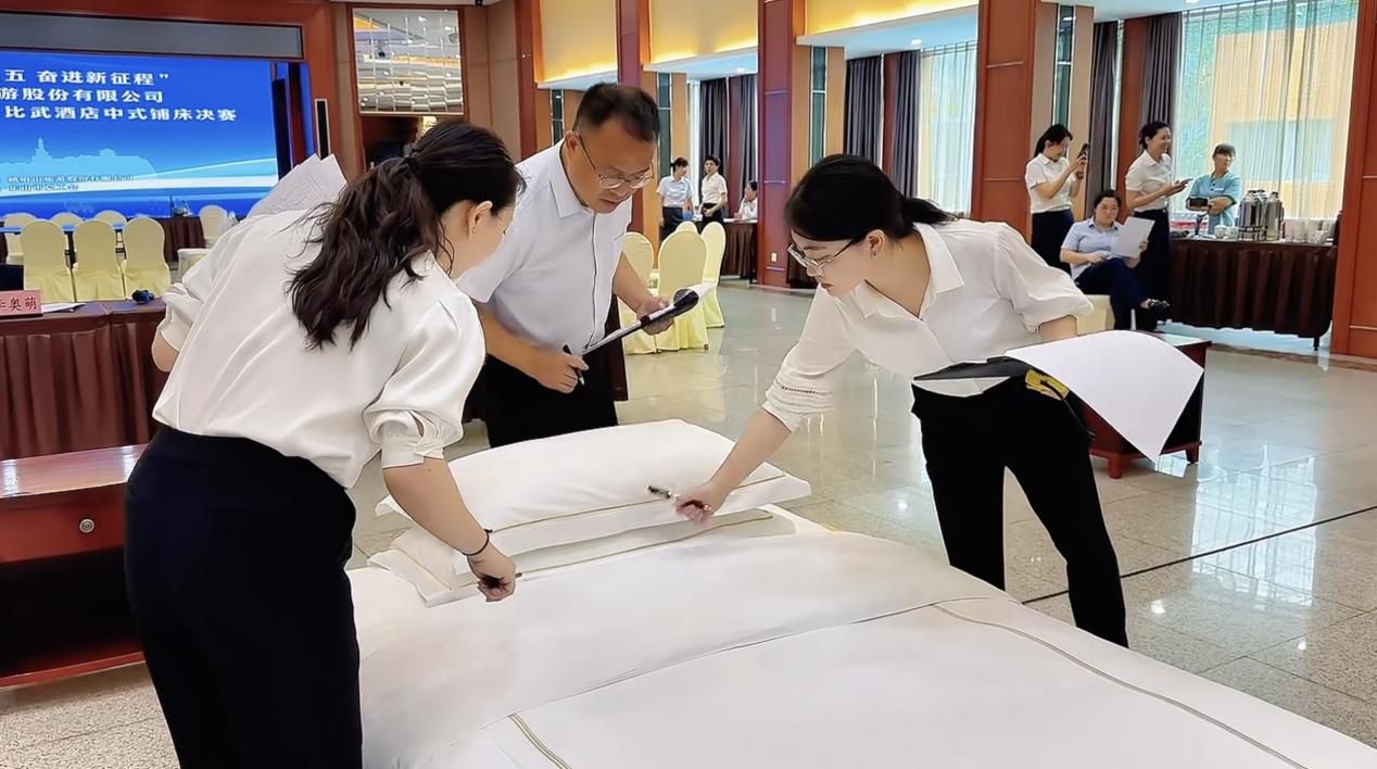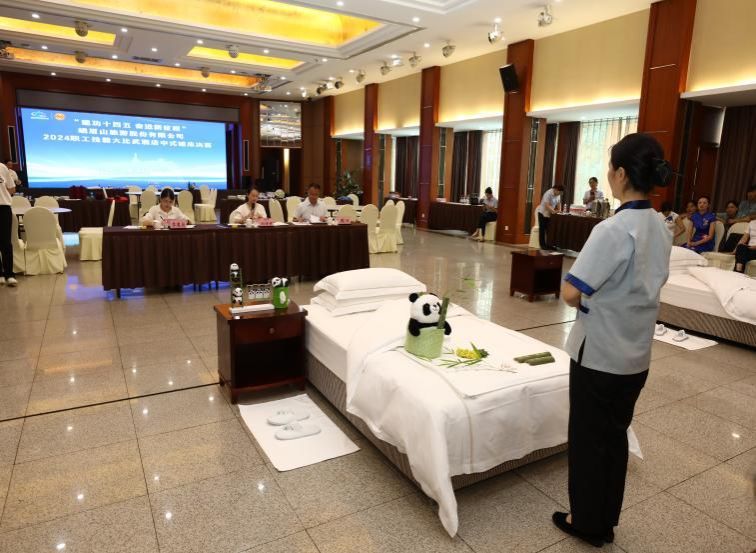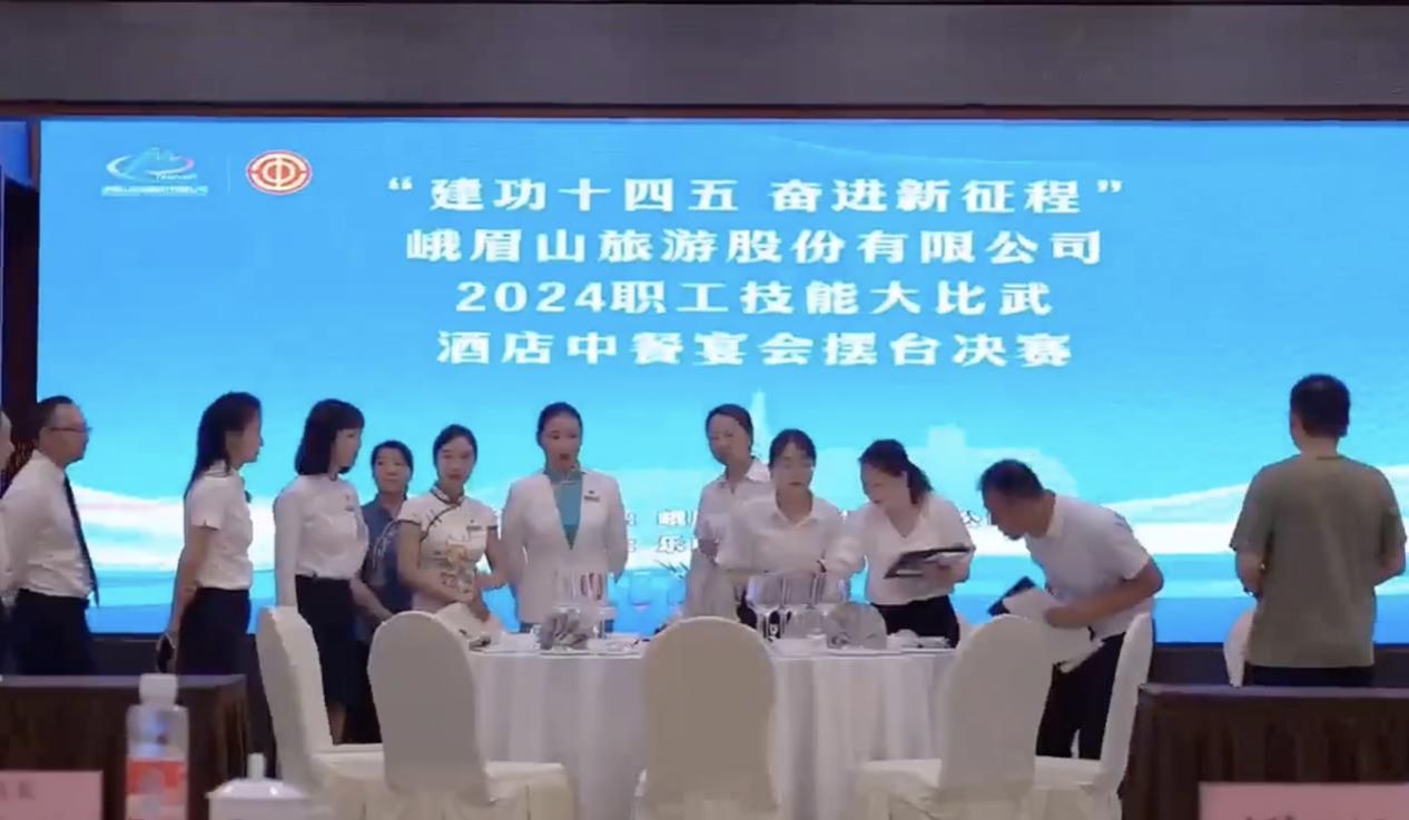2024年6月21日由峨眉山旅游股份有限公司主办的“奋进新征程”2024年职工技能大比武活动在峨眉山旅游股份有限公司峨眉山大酒店分公司举办,伟德官网文化旅游学院教师李奥萌受邀参与酒店中式宴会摆台、酒店中式铺床决赛裁判工作,本项目决赛共有30多位酒店职工参加。