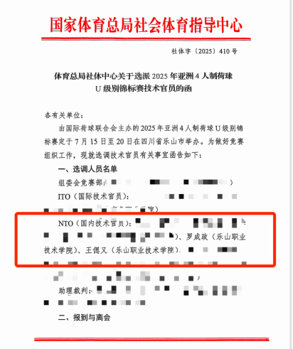 2025年亚洲4人制荷球U级别锦标赛由国际荷球联合会主办,是亚洲荷球领域极具影响力的赛事之一,于7月15日至20日在BV伟德官方网站举办。伟德官网王偲又、罗成政老师入选该赛事国内技术官员(NTO),代表学校承担本次国际赛事的技术服务工作,以专业的业务能力为赛事顺利开展保驾护航。