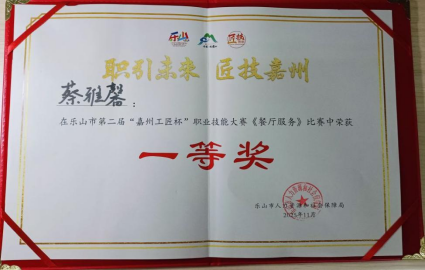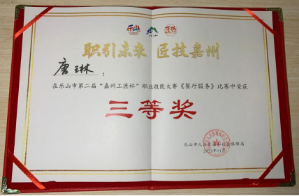 经过认真备赛,在赵太萍与刘梦媛老师的指导下,蔡雅馨的《佛光云海·嘉州禅韵——康养疗愈中老年团养生晚宴》中餐主题宴会摆台与服务荣获餐厅服务赛项一等奖,唐琳的《嘉州叶语·竹韵茶香——商务交流宴会》中餐主题宴会摆台与服务荣获餐厅服务赛项三等奖。