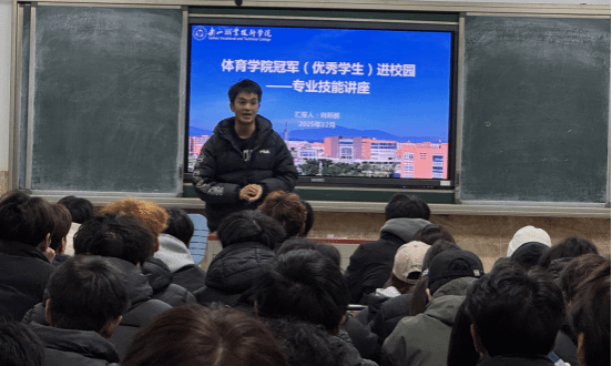 2025年12月14日19点至20:30,体育学院2021届毕业生,全程马拉松、半程马拉松国家级运动健将--向新鹏重返母校,在1B205教室,为校师弟师妹带来了一场题为“从校园跑到专业赛道”的精彩讲座,在刚刚结束的2025年乐山“双遗”马拉松全程比赛中,向新鹏获得亚军。讲座由体育学院副书记刘飞飞主持,全体在校学生及辅导员老师到场聆听,现场气氛热烈,掌声不断。