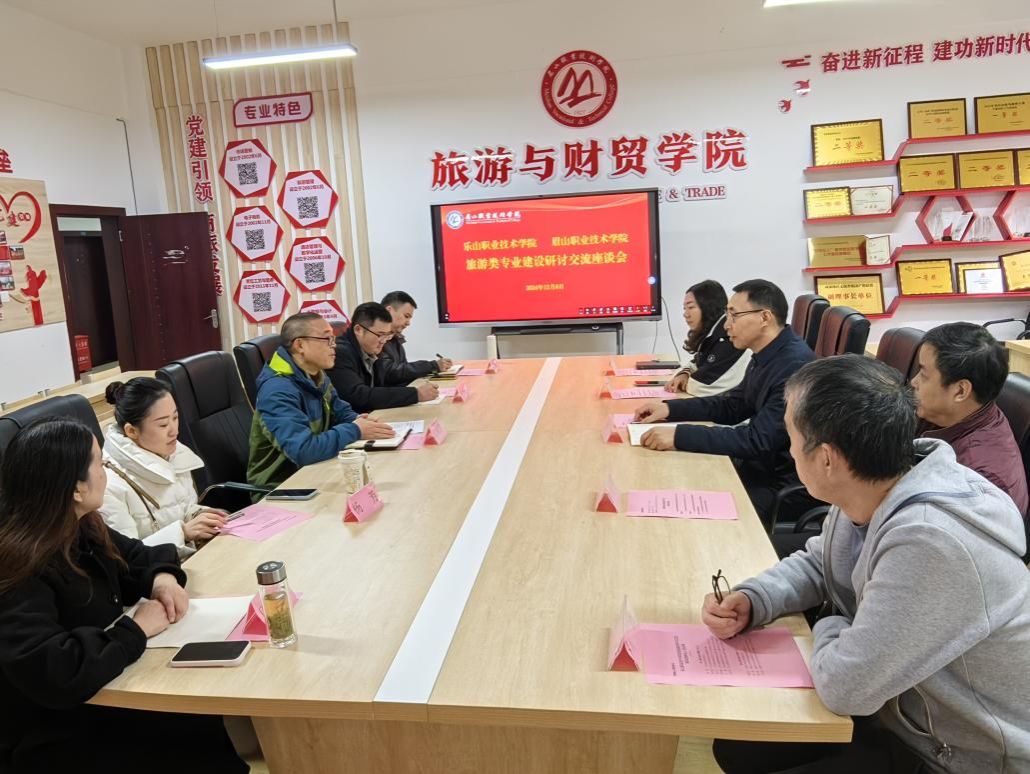 12月6日上午,调研团队与眉山职业技术学院旅游与财贸学院院长廖明江、酒店管理与数字化运营专业和烹饪工艺与营养专业教师进行了交流座谈,廖明江介绍了旅游与财贸学院的基本情况、各专业办学经验、办学成果,杨帅就文化旅游学院各专业建设情况做了分享,随后专业老师们就专业人才培养方案、课程建设、实习就业等工作进行了交流学习。会后,廖院长带领大家参观了财贸与酒店智慧实训中心。