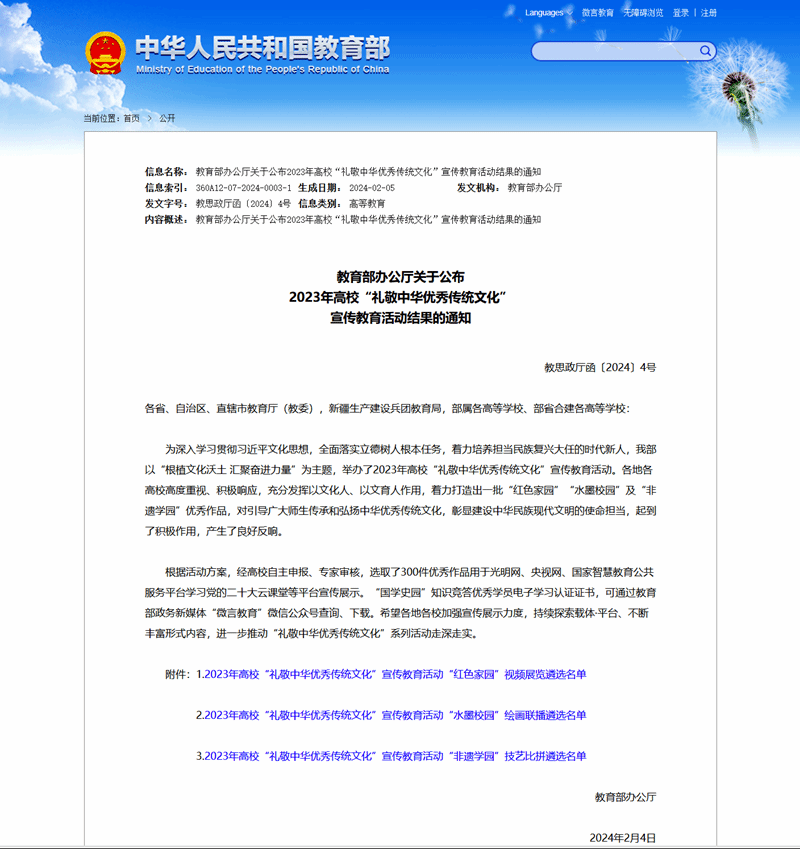 本次宣传教育活动包括三项专项活动,分别是“红色家园”“水墨校园”“非遗学园”三个主题,每个单元各征集作品100个,共遴选300个优秀成果入围。四川高校共有12个作品上榜。其中伟德官网作品《武动青春》成功入选并在国家级平台央视网进行了展示,这是伟德官网自教育部启动“礼敬中华优秀传统文化”活动以来首获此殊荣。