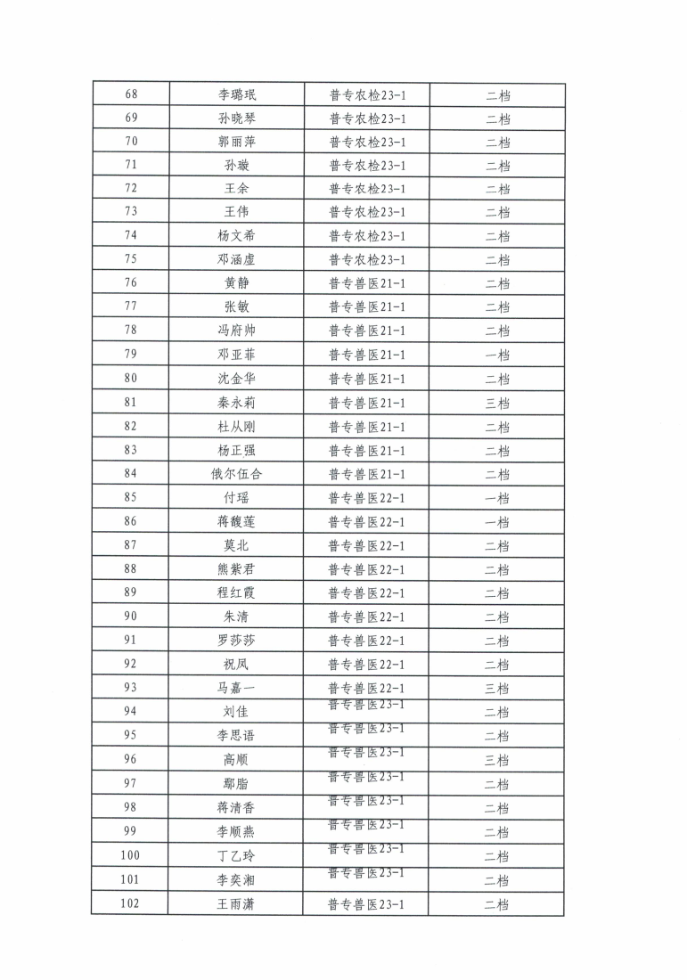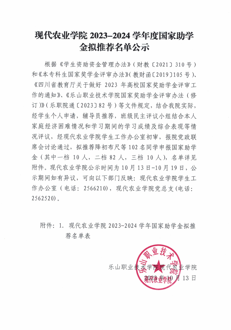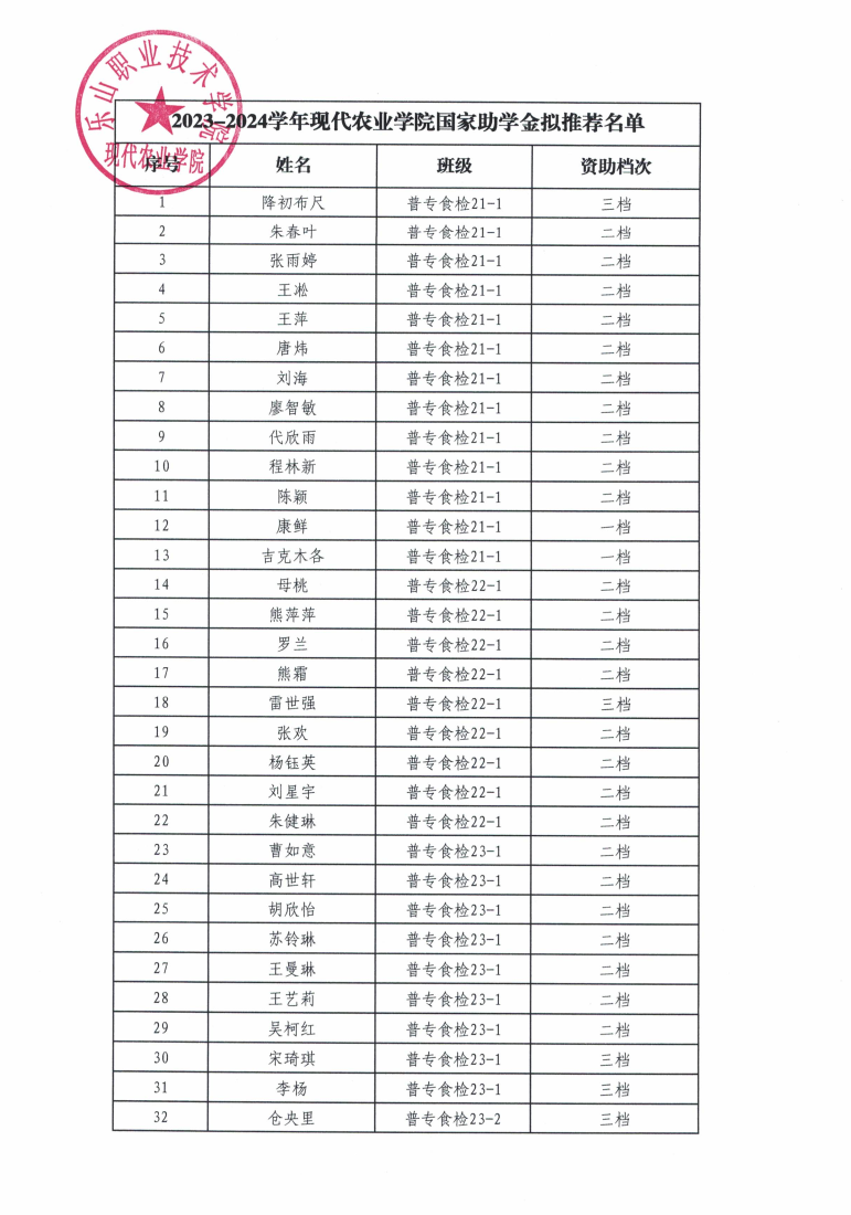 现代农业学院2023-2024 学年度国家助学金拟推荐名单公示
