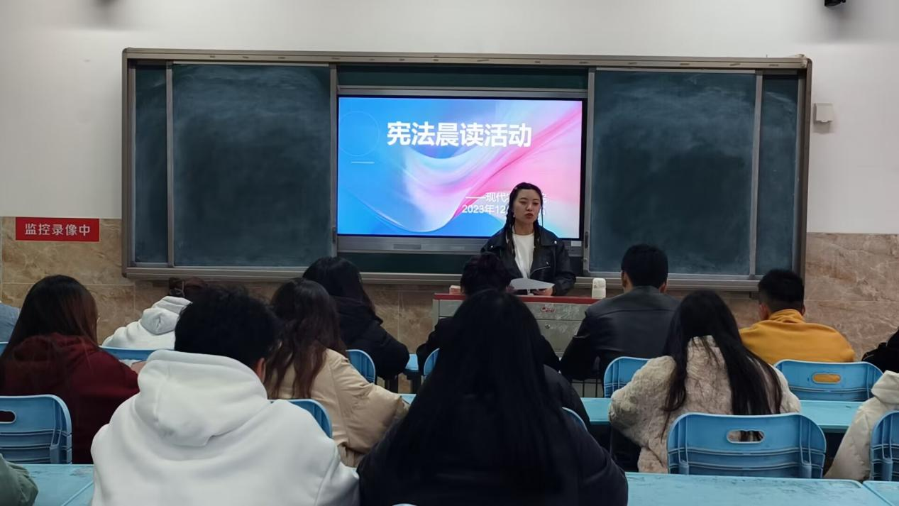 2023年12月4日,现代农业学院组织全院学生通过教育部全国青少年普法网收看网络直播。12月5日-10日早上8:10分,开展“宪法晨读”环节,由现代农业学院团委书记汤秀娟领读宪法部分条款,现场学生及全体人员跟读,晨读环节完成后进入《宪法伴我们成长》歌曲传唱环节,学生代表带领全体学生齐唱歌曲,营造了良好的学习氛围。
