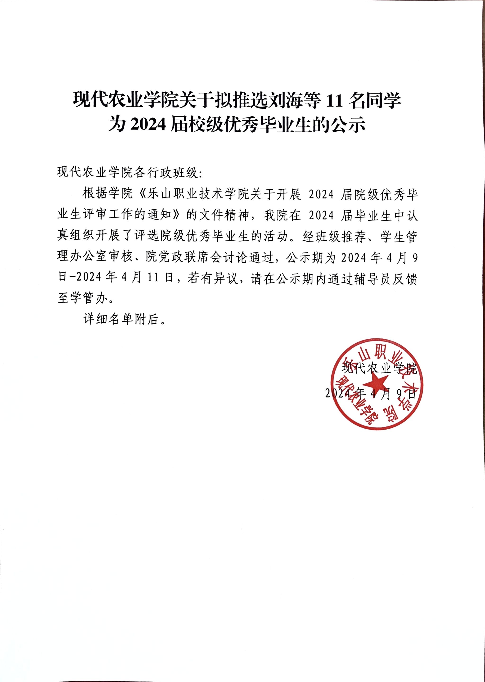 现代农业学院关于拟推选刘海等11名同学为2024届校级优秀毕业生的公示