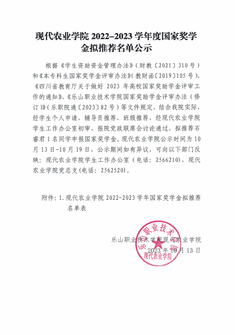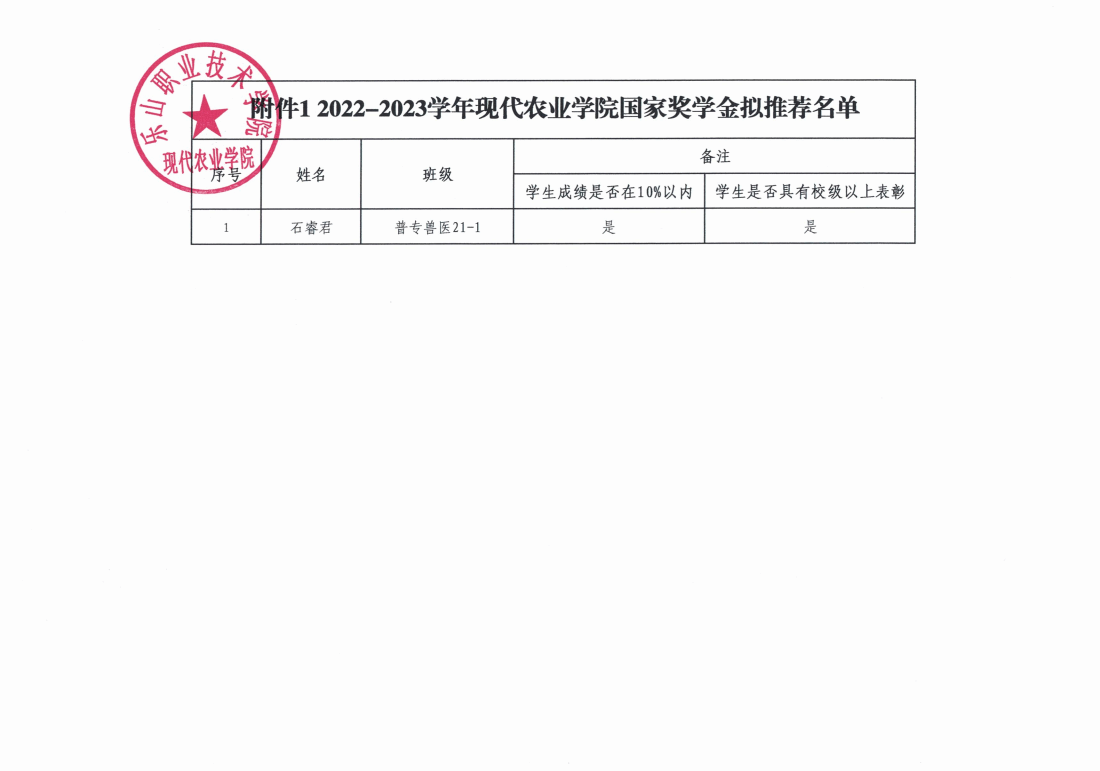 现代农业学院2022-2023学年度国家奖学金拟推荐名单公示