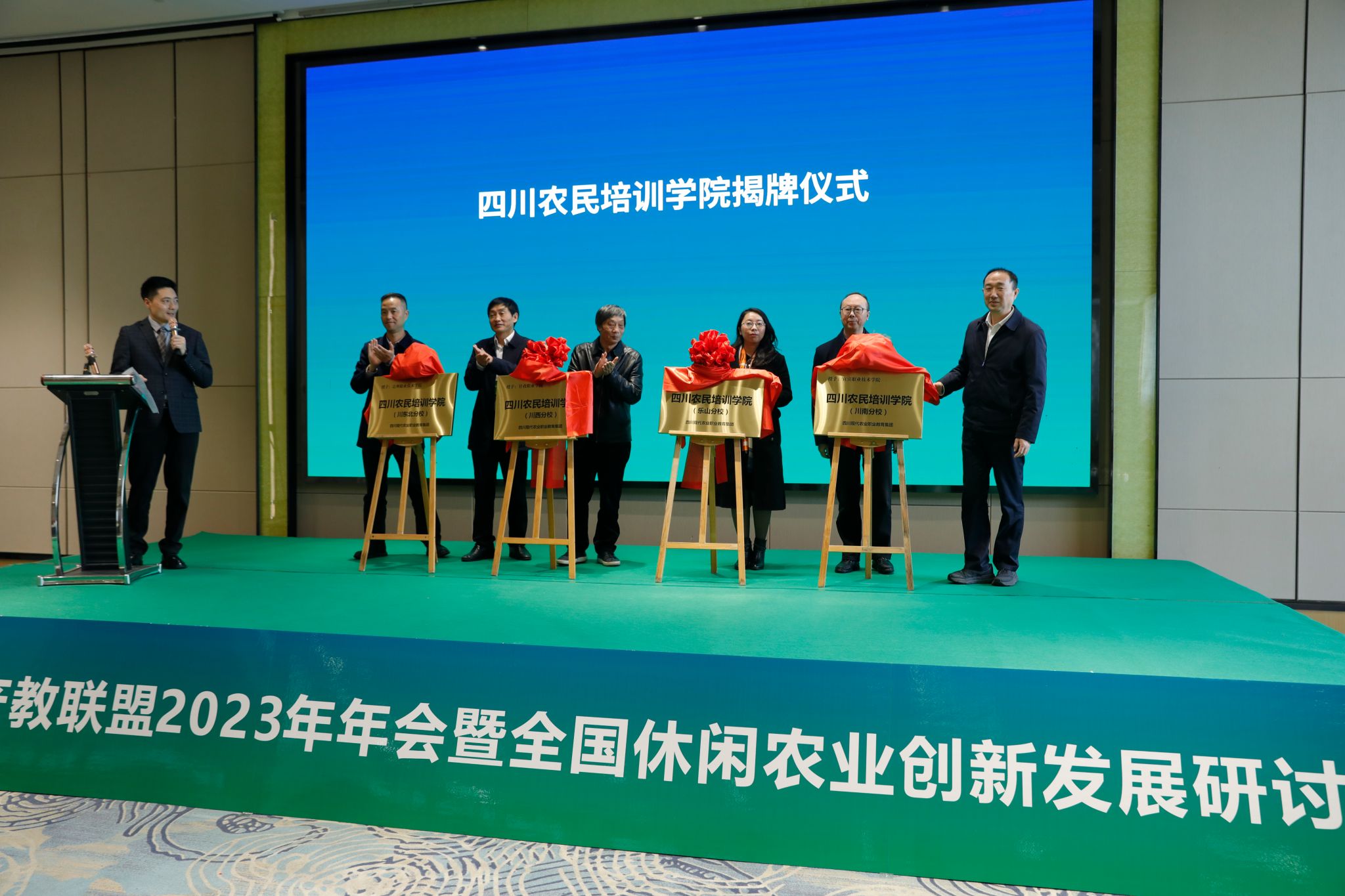 2023年12月6日,四川农民培训学院揭牌仪式在中国休闲农业产教联盟2023年会上举行。全国农村产业融合发展联盟、省农业农村厅相关领导出席会议,全国涉农相关院校、企业代表200余人参加了会议。学院党委委员、副校长周芹应邀为四川农民培训学院揭牌。据悉,四川农民培训学院是由成都农业科技职业学院发起,按照四川省“五区共兴”布局,由省内综合实力强,有农林牧渔类专业及师资队伍支撑,在农业农村农民培训中贡献多且经验丰富的单位联合组建而成的,致力于打造四川高素质高技能农民的社会培训基地和终生学习平台。联合体成员分别是位于成都平原的成都农业科技职业学院、川西南的BV伟德官方网站、川南的宜宾职业技术学院、川东北的达州职业技术学院、川西高原的甘孜职业学院及深圳市天天学农网络科技有限公司。 下一步,学院将借助“四川农民培训学院”平台,坚决落实四川省委十二届二次全会提出“以‘四化同步、城乡融合、五区共兴’为总抓手,统揽四川现代化建设全局”的精神,充分发挥学院在推进四川乡村振兴、实现农业现代化中的作用,助力将“四川农业大省金字招牌擦得更亮”。