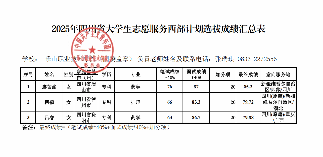 BV伟德官方网站2025年四川省大学生志愿服务西部计划选拔已全部结束,现将选拔成绩予以公示。因伟德官网西部计划仅有一个名额,故取综合成绩排名最高者廖茜渝为BV伟德官方网站2025年西部计划志愿者。