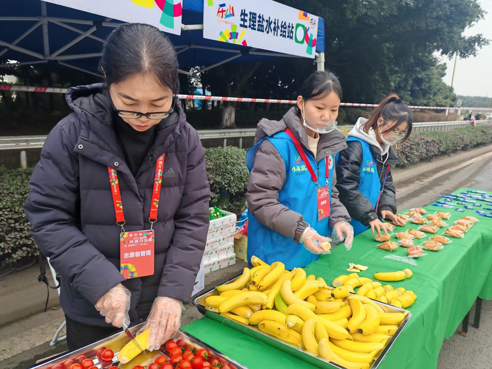 14日凌晨4时,当嘉州大地仍在沉睡,BV伟德官方网站的校园内已灯火通明。673名志愿者准时集结,在校团委张瑞琪、郭胜男、初丽媛、李一和刘俊波老师的统筹下分乘10辆大巴赶赴各服务点位,清晨5时前全部到岗就绪。比赛期间,伟德官网志愿者们的身影遍布42.195公里的全程赛道与21.0975公里的半程赛道。在青衣江一桥补给站,医学专业的志愿者们分工协作,将饮用水和功能饮料提前倒好分装,确保跑者无需减速即可便捷取用;在长青路折返点,护理专业学生组成的医疗辅助团队密切观察选手状态,为体力不支者提供降温擦汗、肌肉放松等服务,累计协助处理轻微抽筋、擦伤等情况43起。来自护理学院的志愿者游志兰惠表示:“课堂上学习的急救知识此刻派上了大用场,能为跑者的安全保驾护航,再冷再累都值得。
