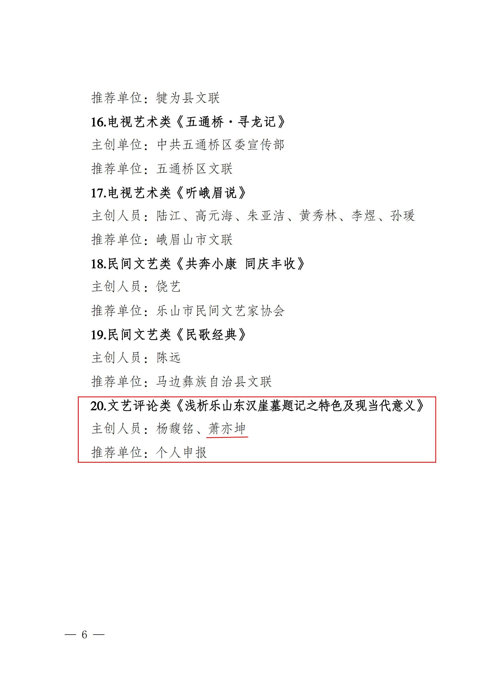 今年 2 月,乐山市文联启动了 2024 年度“20 佳推优”工程申报评选工作,经初审、终审,并结合公示收集到的意见建议,市文联主席团研究决定,评选出“特别项”作品 7 件、“入选项”作品 20 件,组织工作突出单位 10 个。BV伟德官方网站素质教育学院美育教研室教师萧亦坤的文艺评论《浅析乐山东汉崖墓题记之特色及现当代意义》入选2024 年度“20 佳推优”工程“入选项”。