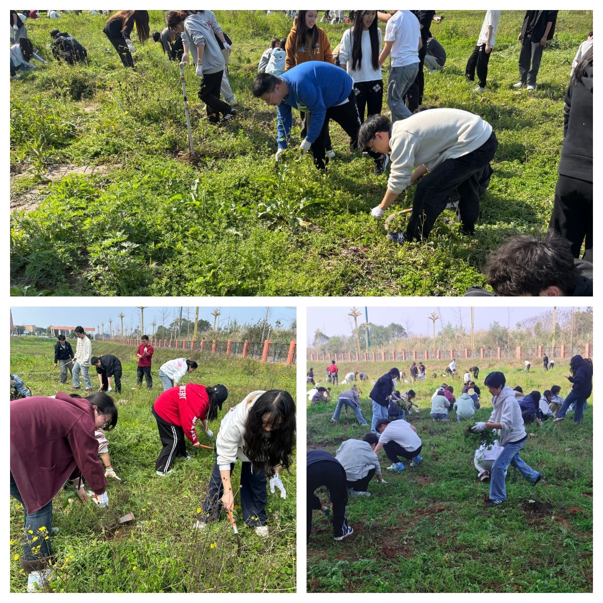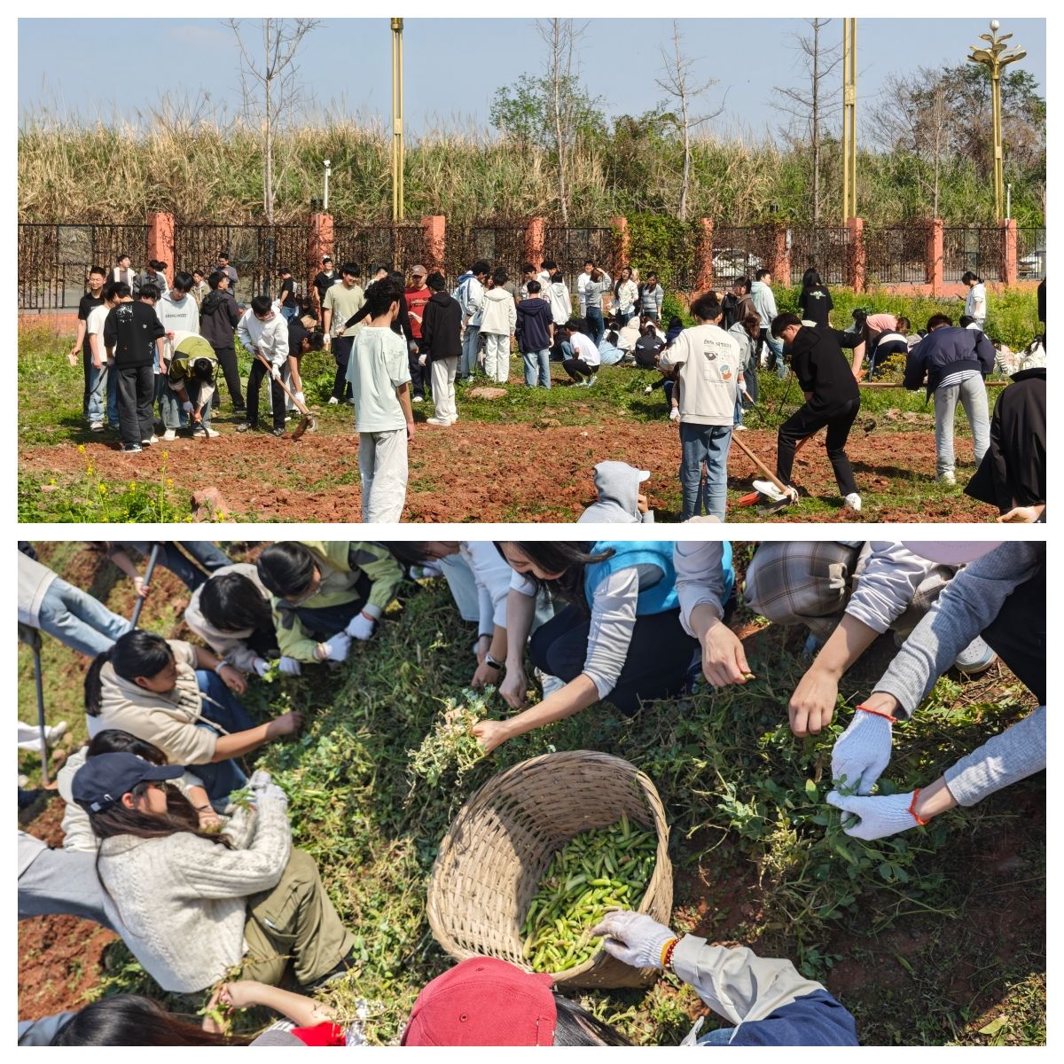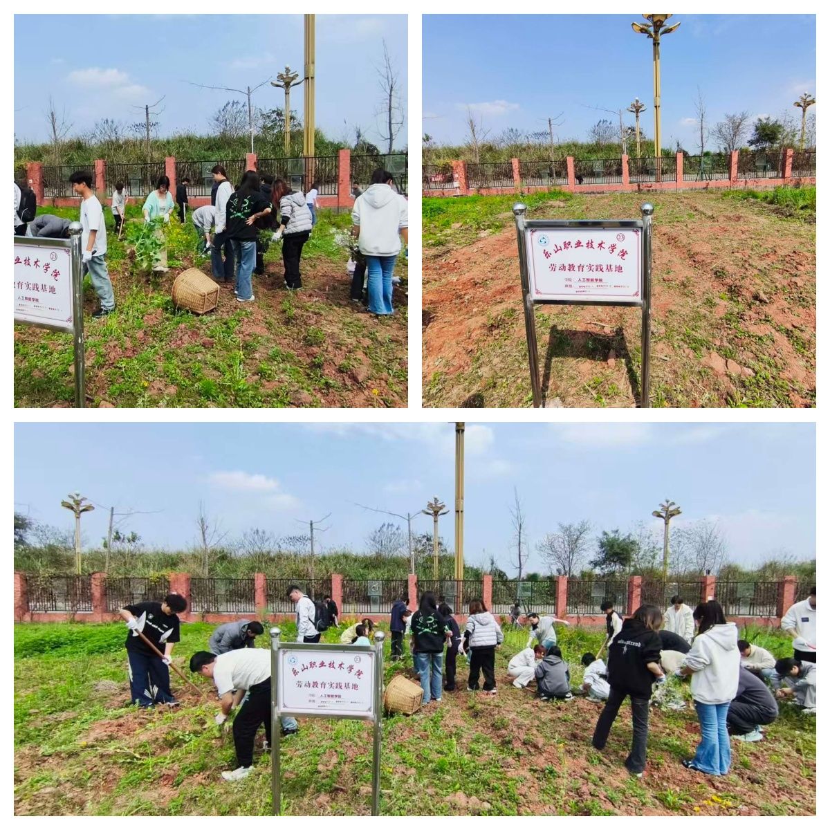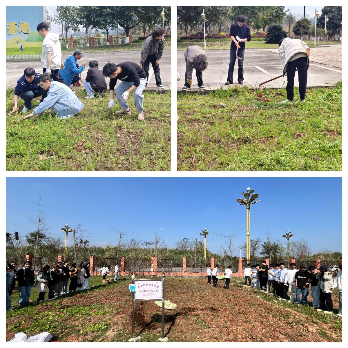各学院劳动教育基地内,师生们积极响应、有序投入春耕准备工作。同学们在老师指导下,手持锄头、铁锹等工具,分工协作、干劲十足,认真完成锄草、施肥、翻土等各项工序。阳光下,铁锹翻起新泥,汗水浸润土地,劳动的号子在田间地头此起彼伏。