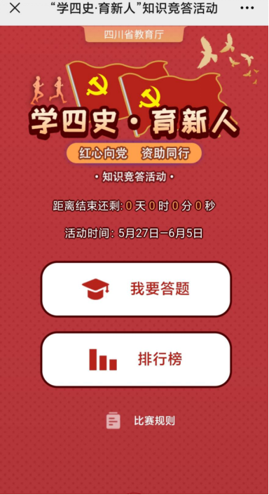 2021年5月27日至6月5日BV伟德官方网站学生工作部组织全院同学开展了学四史和学生资助政策、诚信征信、防诈骗等知识竞答活动,以“四川学生资助”“四川教育分布”等微信公众号为载体进行线上‘学党史 育新人’知识竞答。