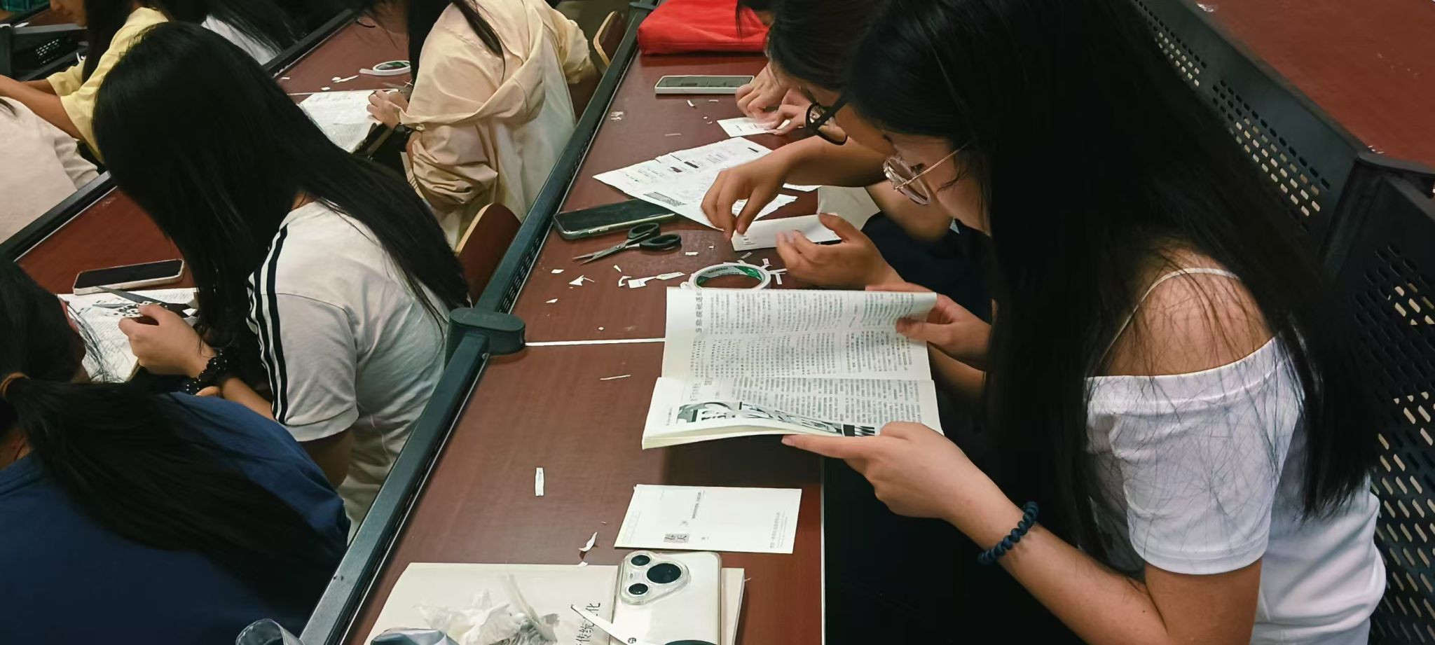 活动伊始,主持人向同学们介绍了拼贴诗的概念及其艺术魅力,并围绕“春天”、“爱”和“自主创作”三个主题展开互动。参与者五人一组,利用提供的贺卡纸、杂志和双面胶等材料,通过剪裁、拼贴和重组文字,创作出独具个性的诗歌作品。活动现场氛围轻松愉快,同学们在创作中尽情发挥想象力,表达内心的情感与思考。