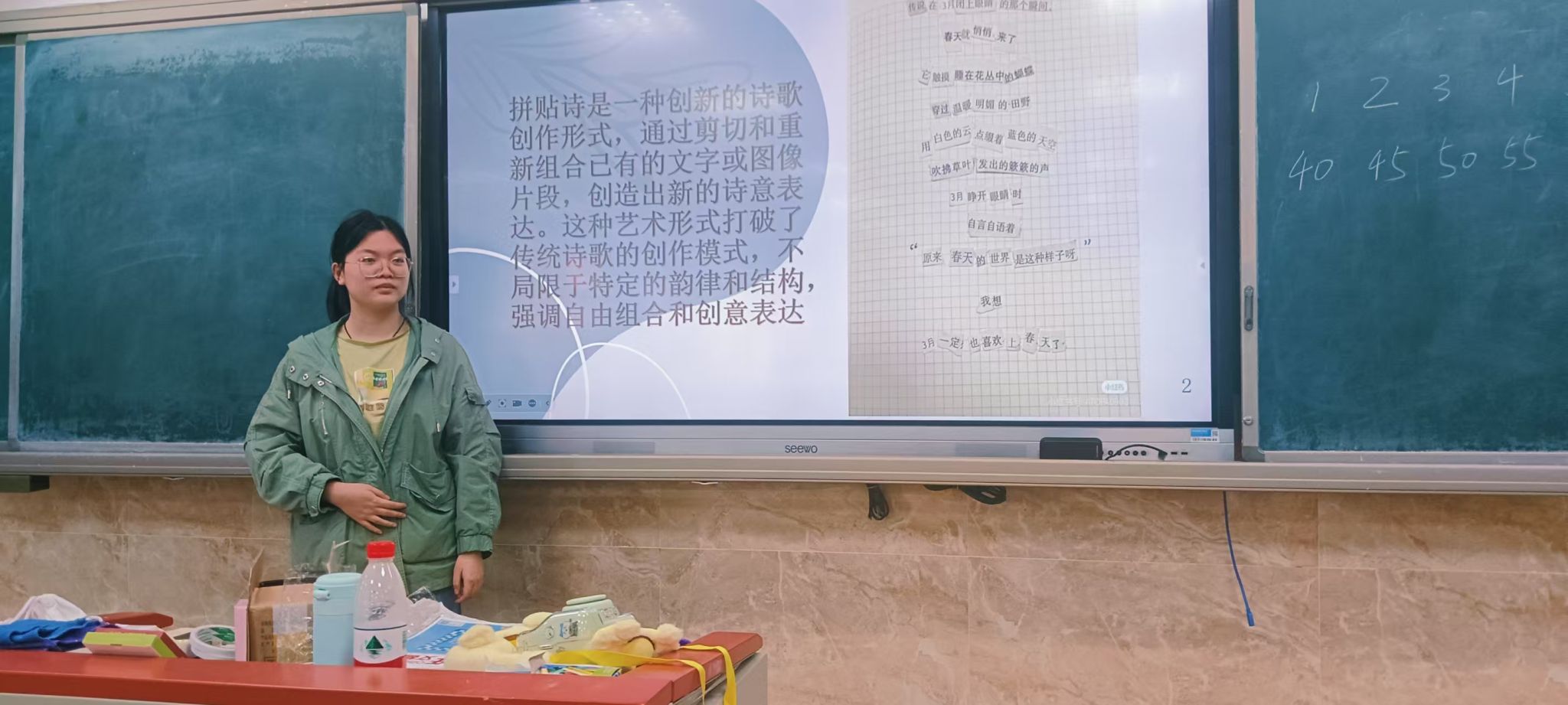 在作品展示环节,每位同学举起了自己的拼贴诗,每一件作品都凝聚了创作者对生活、自然和情感的独特感悟。活动不仅锻炼了同学们的审美能力与创新思维,也为大家提供了一个释放情绪、交流思想的平台。