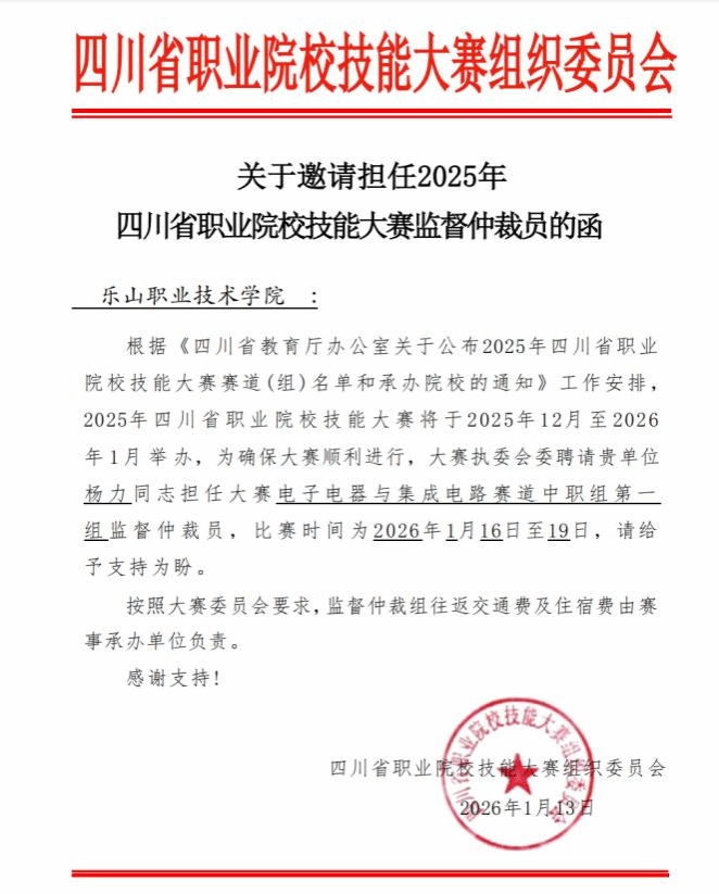 1月16日至19日,2025年四川省职业院校技能大赛“电子电器与集成电路”赛项(中职一组)在宜宾市南溪职业技术学校举行。伟德官网教师杨力受大赛组委会委派,赴宜宾担任该赛项监督仲裁员。