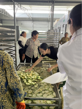 眼下正值佛手采收季节,佛手柑种植基地内一派繁忙景象,采收的佛手正在进行切片烘干工作,徐娇博士认真查看了佛手的切片及烘干情况,并就烘干过程的切片的厚薄、切片的码放、烘干温度等细节问题进行了详细的询问和指导。