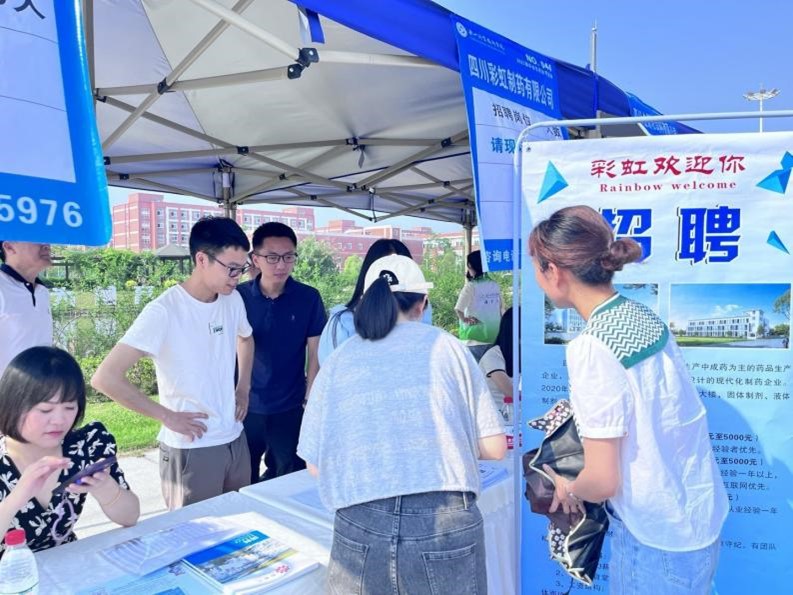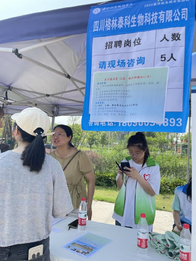 双选会现场,生物医药学院党总支书记徐娇、副院长(主持工作)李喜安、副院长朱链链、药学专业负责人岑菲菲、药物制剂技术专业负责人孙川、学生科科长张俊、分团委书记朱晓琴在双选会现场了解企业用人情况,并与参与竞聘的同学进行亲切地沟通、交流。据统计,我院对应的企业单位共收到1000余份简历。
