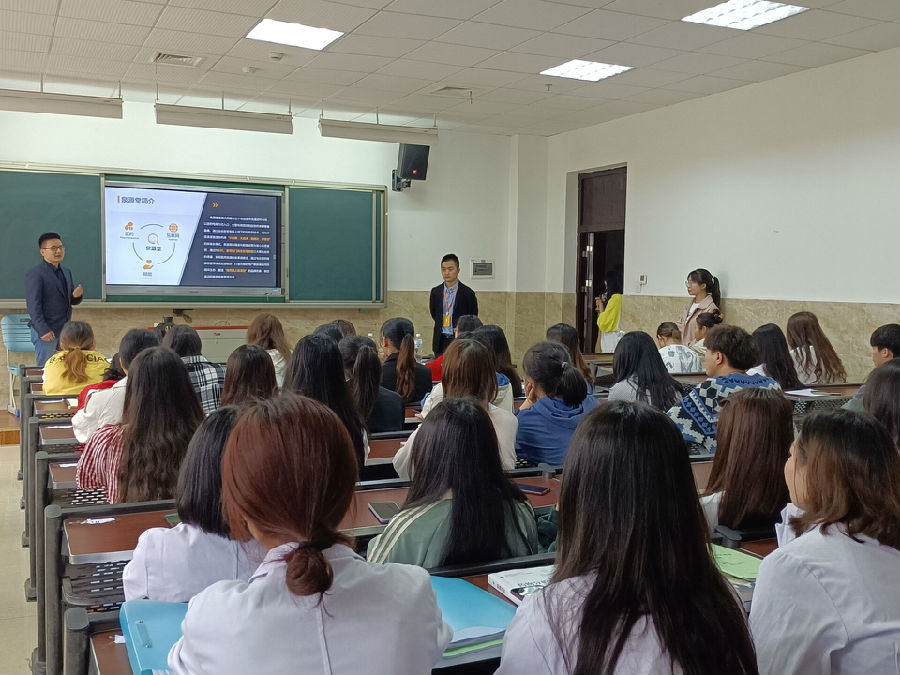 韩龙老师以企业的宣传片拉开此次宣讲会的帷幕,并以幽默的方式调动起了同学们的热情。随即,张奇骏老师从企业简介、企业历程、福利待遇、销售方式这四个方面,为同学们介绍成都泉源堂大药房。其中,张奇骏老师重点为同学们介绍了线上销售模式,同时,老师也邀请了学姐黄瑶为同学们分享自身的实习经历及成长历程。最后,同学们向袁维老师提出自己对工资、工作内容及工作时间的疑问,袁维老师耐心为同学们解疑。