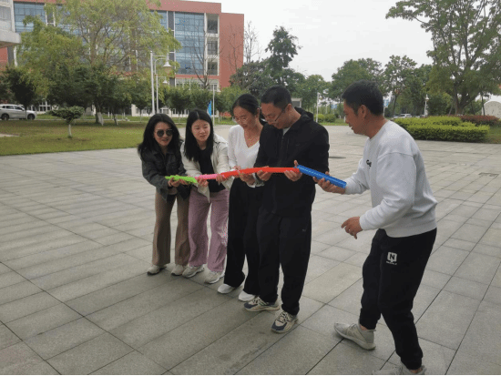 活动现场,教职工分为两个小组,两组教职工热情高涨,迅速投入到“珠行万里”“不倒森林”“一圈到底”等趣味项目中。在“珠行万里”环节,大家手持半圆形槽管,接力配合将小球平稳传递至终点。过程中,现场不时传来阵阵紧张的提醒声与加油声,教职工们全神贯注、默契协作,为了团队目标全力以赴。“不倒森林”考验的则是成员间的注意力与协调性,每人手抵一根塑料杆,在规定时间内迅速换位并保持杆不倒。大家屏气凝神,相互配合,失误时一笑而过,成功时击掌庆祝,现场充满了欢声笑语。而“一圈到底”项目中,队员们手拉手围成一圈,仅依靠身体的扭动传递圆环,整个过程既充满挑战又趣味横生,大家在一次次尝试中不断磨合,逐渐找到最佳节奏。两组教职工你追我赶,既展现出激烈的竞争意识,又彰显出团结友爱的精神风貌。